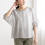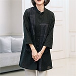 伝統とさわやかさの融合「久留米織」2色の生地を使ったアシンメトリーな切替えがエレガントな雰囲気を演出。スタンド襟で顔周りがすっきりとして着るだけでこなれた装いになる一枚です。